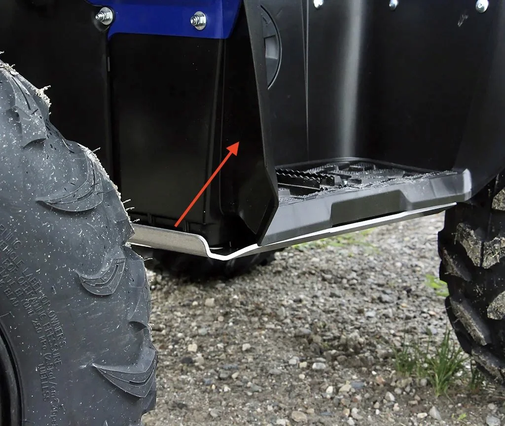 First, note that the splash guards are directional. One fits the left side of the ATV while the other fits the right side. Be sure the notched section of the splash guard is facing inward toward the center of the ATV as shown in the picture below. In addition, be sure the top edge of the splash guard is placed tightly against the lower edge of the fender (where the fender and footwells meet). This is also shown in the photo below.