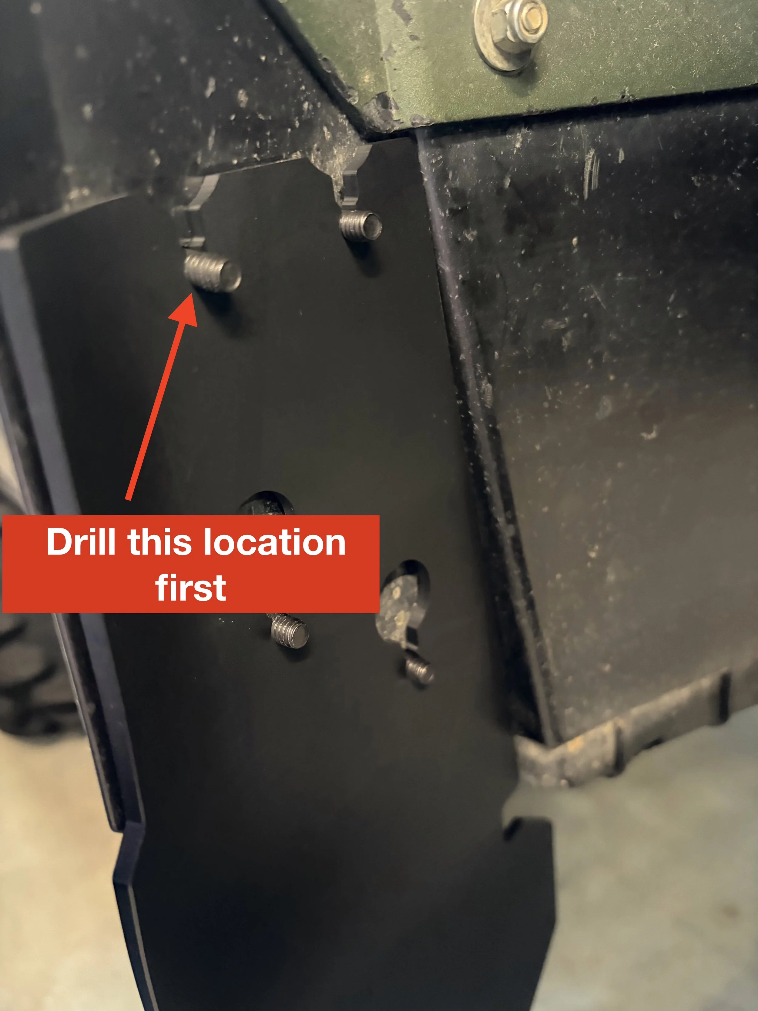 Using the 1/4” drill bit, prepare to drill the four installation holes. With the splash guard held firmly in place against the footwell, drill the first hole beginning with the upper left location shown in the picture below. Before drilling, be sure to position the drill bit into the lower section of the installation hole.